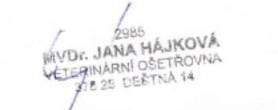 Upozornění Revizní komise Krajská veterinární správa Státní veterinární správy pro Středočeský kraj v souvislosti s kontrolou provedenou v chovné stanici psů zjistila, že ve více chovných stanicích bylo k potvrzení tetování, a nejméně v jednom případě k potvrzení vakcinace psa, použito razítko 2985, MVDr. JANA HÁJKOVÁ, VETERINÁRNÍ OŠETŘOVNA, 378 25 DEŠTNÁ 14. Revizní komise sděluje, že v evidenci KVL ČR pod registračním číslem 2985 není a ani nikdy nebyla registrována MVDr. Jana Hájková, Deštná 14, 378 25 Deštná. Veterinární osvědčení či potvrzení opatřená tímto razítkem nelze považovat za platná. Žádáme veterinární lékaře, aby v případě zjištění jakýchkoli veterinárních listin opatřených tímto razítkem takovou listinu pokud možno zabavili (nebo alespoň okopírovali) a odeslali na sekretariát KVL k rukám Revizní komise, a pomohli tak zabránit dalšímu možnému zneužívání tohoto razítka. Obr.: Otisk inkriminovaného razítka:
